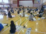1時間目、体育館には4年生がいます。用具を整え、気持ちを整えて、静かな雰囲気の中で集中して書き始めます。4年生は… |
