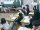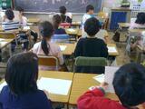3時間目。2-3は音楽です。今月の歌「絆」を歌っています。高い音域の部分をきれいに発声しています。児童の前で指揮をしながら「きれい!」と担任から称賛の声が出ています。2-1は国語です。「楽しかったよ、2年生」の発表がこれから行われるようです。原稿を見ながら練習をしている児童、原稿を裏にして練習をしている児童、自分で作った原稿をもとに一生懸命練習しています。3-2は国語です。「理科の時間に、豆電球とかん電池をつないで回路を作った」など、これまで習った漢字を使って、各教科で習ったことを文章にしています。