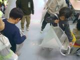 3-1は社会です。未来の新座市を想像してポスターを書いています。「楽しく平和で安心できる町」「大人になっても帰っておいで」など、これまで学んできたことをもとに、未来の新座を想像しています。5-1は掲示物をはがしたり、個人個人に配ったりしながら持ち帰るものを整理しています。図工や書写、学習カードなど、様々なものがまとめられています。5-3は屋台形式のお店を開いています。射的やくじ引き、輪投げなどのお店を、クラス内の通貨を作って楽しんでいます。看板を持って呼び込みをする姿も見られます。