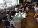 4時間目。3-3は図工です。作り上げた自分だけの筆を作品カードにまとめています。すでに登校してある作品カードを見ながら、「この作品すごいなあ」とつぶやいている児童がいます。4-3は学級活動です。クリスマス会の準備をしています。プログラムを作ったり、掲示を作ったり。調べながらクリスマスのイラストを書いている児童もいます。1-3は体育の後の振り返りです。マット遊びを振り返っています。「かわとびでジャンプができるようになった」など、この単元を振り返っています。