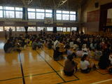 5時間目。体育館では5年生が書きぞめを行っています。今年の文字は「新たな心」です。漢字と平仮名が混ざるバランスのとり方に工夫が必要な文字です。まずはお手本の文字をなぞり、書き順やバランスを確認します。条幅にも墨をつけずに筆でなぞり書き。4文字がバランスよく入るように大きさを確認します。準備を終えて、いよいよ墨をつけて書きぞめの開始です!