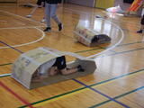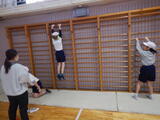 1時間目。たんぽぽ学級は体育です。「いろいろなどうぐでうんどうしよう!」と、様々に用意された場で運動に取り組みます。肋木ではぶら下がったり逆立ちをしたり、片手を放してじゃんけんをしたりと、できる動きを楽しんでいます。缶ポックリは缶の上に乗ってひもをつかみながらゆっくり歩きます。坂やコーンのコースをクリアしていきます。段ボールキャタピラーはリレーをして楽しんでいます。前が見えない段ボールの中ですが、勢いよく前に進んでいきます。自分のチームを応援する声にも力が入っています。