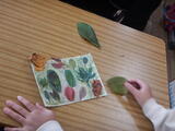 3-2は外国語活動です。色と形を組み合わせて、いろいろな形を作り出しています。青い長方形と黒い円が二つ何になるかな?とみていると、「車だ!」気づいた児童から声が上がります。一通り確認した後、”black circle"など音源の後に続いて練習をしています。3-3は図工です。秋の葉を集めてその色を作りながら絵に表現しています。鑑賞するために作品をロイロで写真にとるときには、周りに葉を並べたり日差しを写真に入れたりと見せ方も工夫しています。4-1は理科です。ロイロで整理しているのは秋の写真です。自分たちが見つけた秋の植物などを共有しています。赤く色づいている木の葉など秋が感じられるものが紹介されています。