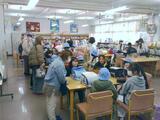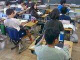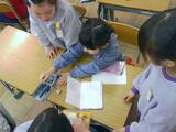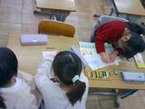 たんぽぽ学級で刻んでいるのは、野菜です。給食室で出た野菜の皮や切れ端をはさみで刻んでいます。小さく刻んだ後は、たい肥にしていくそうです。毎年行っている農園での野菜作りのために、肥料作りから始めているたんぽぽ学級です。1-3は国語です。「ずうっと、ずっと、大すきだよ」を音読しています。読み終えた児童から視写に取り組んでいきます。3-3は図工です。朝から大きな段ボールを運んでいた3年生。「クミクミックス」というこの造形あそび。一人で組んでいく児童も横につなげて他の児童と作品を交わらせていく児童も、切れ込みを入れて段ボールをどんどんつなぎ合わせて作品にしていきます。