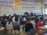 朝の時間は6年生ありがとうの会です。5年生が中心となって会の流れや分担などを相談、準備してきました。今日も登校後、それぞれの教室に向かって机と椅子のレイアウトを計画に沿って整えていた班もありました。会は、1年生が6年生をお迎えに行くところからスタート。6年生は1年生に案内されて教室に。他のメンバーは拍手で6年生を迎えます。