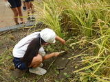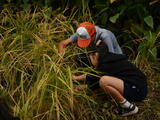 今日は5年生の稲刈りの日です。今回も学校運営協議会委員の方が3名、ボランティアで指導に来てくださいました。有り難うございます!防鳥ネットを外し、ネットをかけていた枠組みを解体して、いよいよ稲刈りです。のこぎりのような稲刈りの鎌。ザクザクと順調に鎌を動かしている児童に、稲刈りをしたことがあるのと尋ねると、「「おばあちゃんの家に行った時にやらせてもらった」との返事が返ってきます。1回目はうまくいかなくても2回目はぐっと上手になっている児童もいます。刈り終えた稲は体育館に運んで2階に干します。次は、茎が茶色くなったころに脱穀をする予定です。