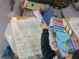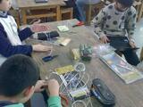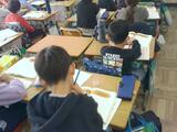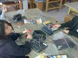 3-2は国語です。ありの行列を読み取っています。教科書のヒントをもとに、文末の「-ました。」「-です。」などの書きぶりの違いに注目し、線を引きながら比べる作業に入るところです。どんな違いが見つけられるでしょう。5-1は図工です。様々な太さの針金を組み合わせて作品作りを進めています。太い針金でまず土台を作るところから始める児童、細い針金でいろいろな形を作り出す児童、手で曲げたりペンチを使ったり、それぞれが試行錯誤しながら作品作りを進めています。1-3は凧作りです。凧に絵を書いているところです。好きな絵を書いているようですが、好きな給食のメニューを書いたり、キャラクターを書いたり、季節柄、鬼の絵を書いている児童も多くいます。