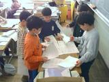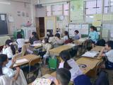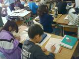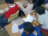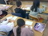 3-3は外国語活動です。これまで習った言葉を使ってクイズを出しています。"White and brown""Sweets""Triangle"とヒントが出されます。「ケーキ!」「チョコレート!」「アイス!」どうやら"Triangle"は絵に書いた時の持ち手のコーンの形のようです。3-2は算数です。□を使った式を作る文章問題に取り組んでいます。自分で〇つけをしたり聞いたりしながら自分で学習を進めています。3時間目。2-1はお手紙を書いています。6年生へのお手紙です。縦割り班でお世話になった思い出とともに、感謝の気持ちを書き込んでいます。