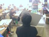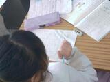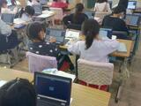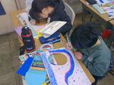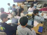 1-1は国語です。「いいこといっぱい一年生!」の単元です。書き出した作文メモをもとに、原稿用紙に作文を書き出していきます。生活科見学のこと、逃走中のこと。「」を使ったり段落を使ったり。書き方と内容のどちらも気を付けて書いていきます。3-3は図工です。画用紙には穴が開いています。どうやら、そこに自分の顔をはめ込んだらどうなるのかを想像しながら絵を書いているようです。海の中、動物になって、様々な発想が生まれています。2-3は国語です。主語と述語のある文を考えています。「おじいちゃんは休む。」など、ノートに書いた文の中から選んで、ロイロノートに入力し、お互いの考えた文を読み比べていきます。