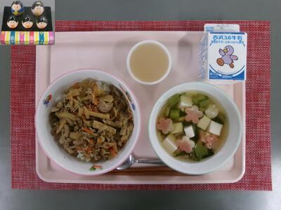 【5年生が考えた献立】 牛乳 五目ごはん かきたま汁 ほうれん草と白菜の ごま和え |
