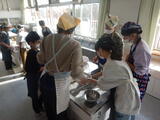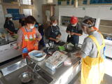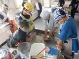 1時間目。家庭科室にいるのは5-2です。今日は家庭科で、和食の基本となるごはんとみそ汁づくりを行います。今日も学習支援ボランティア(見守りレンジャー)お料理ピンクの皆さんが来てくださいました。皆さん、有り難うございます!朝のひんやりした水でご飯を研ぎます。お米を手で押さえながら、丁寧にとぎ汁を流していきます。今日の味噌汁は煮干しで出汁を取ります。器に用意されているだけでふわっと煮干しの良い香りが漂っています。この後の調理、試食が楽しみです。