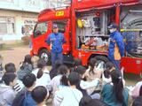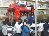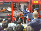 3時間目はクラスごとに活動を実施。消防車のグループは、消防車の仕組みを説明していただいています。説明に使っているのはポンプ車です。消火栓などにつなぐホースや水を放水するノズル、実際に使うヘルメットなどの実物を使って説明をしてくださいました。