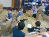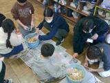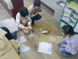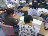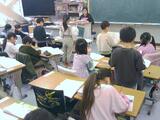 たんぽぽ学級で刻んでいるのは、野菜です。給食室で出た野菜の皮や切れ端をはさみで刻んでいます。小さく刻んだ後は、たい肥にしていくそうです。毎年行っている農園での野菜作りのために、肥料作りから始めているたんぽぽ学級です。1-3は国語です。「ずうっと、ずっと、大すきだよ」を音読しています。読み終えた児童から視写に取り組んでいきます。3-3は図工です。朝から大きな段ボールを運んでいた3年生。「クミクミックス」というこの造形あそび。一人で組んでいく児童も横につなげて他の児童と作品を交わらせていく児童も、切れ込みを入れて段ボールをどんどんつなぎ合わせて作品にしていきます。